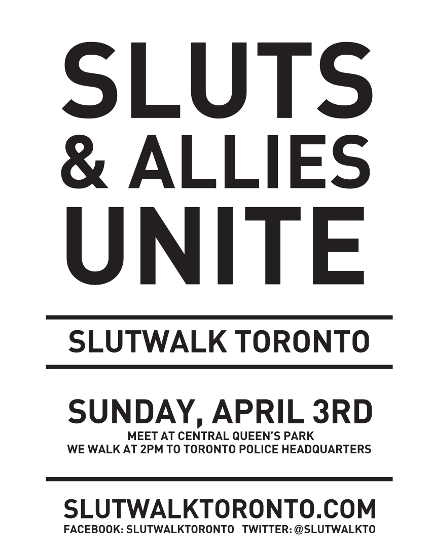 SlutWalk Toronto is going to take place on 03 April. Yes, you read that right, there is going to be a slutwalk in Toronto. What's more, the organizers want to unite with their allies during the slutwalk. Honest. I have proof from their site: